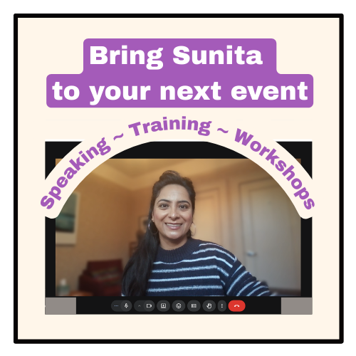 Bring Sunita to your next corporate team meeting or association event. Sunita provides insightful and interactive workshops and talks that will leave your audience with new perspectives and practical tools.